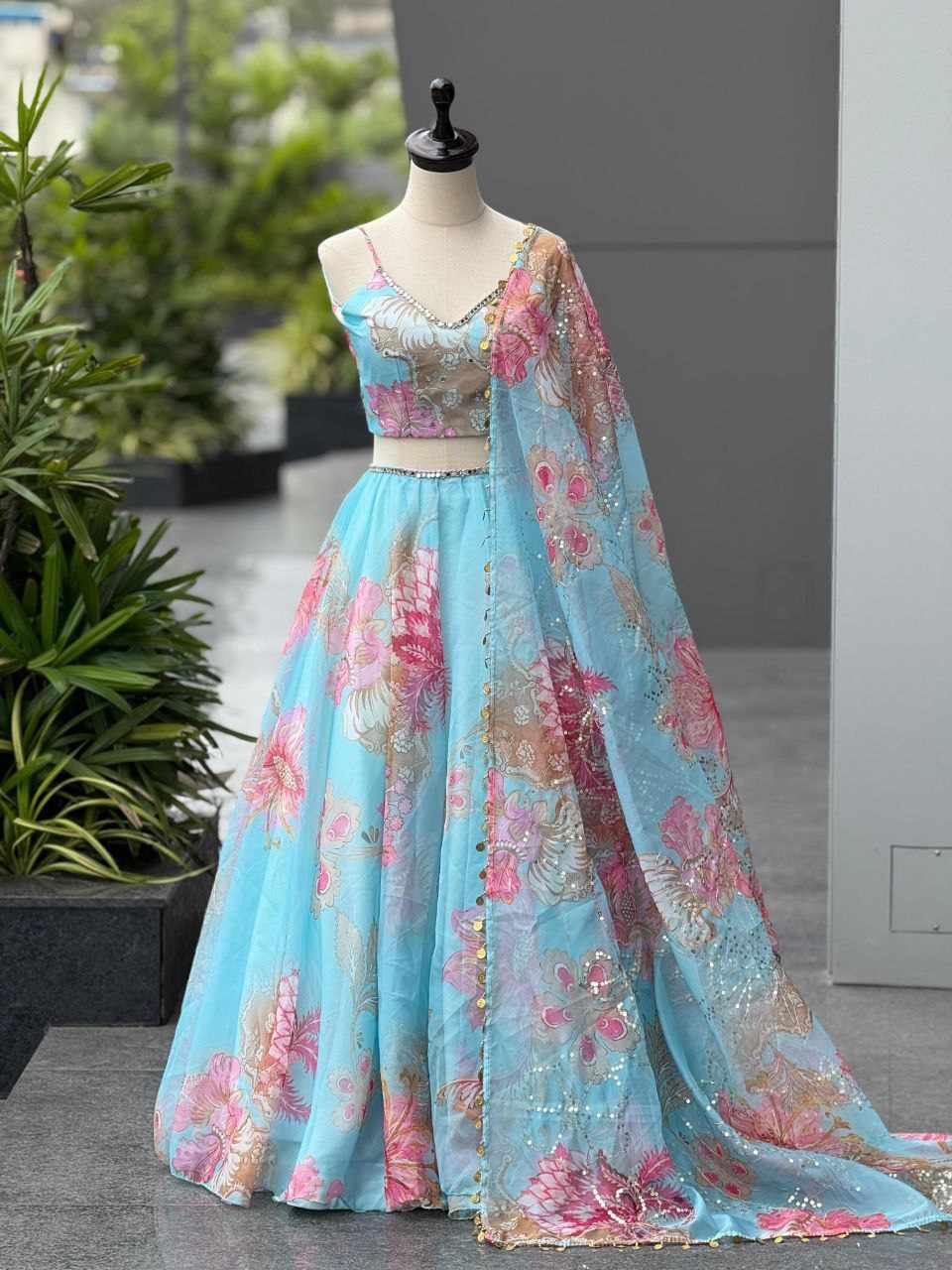Lehenga – Pure organza digital printed lehenga with a grand 8-meter flair. Comes with canvas patta and adjustable waist dori for a perfect fit